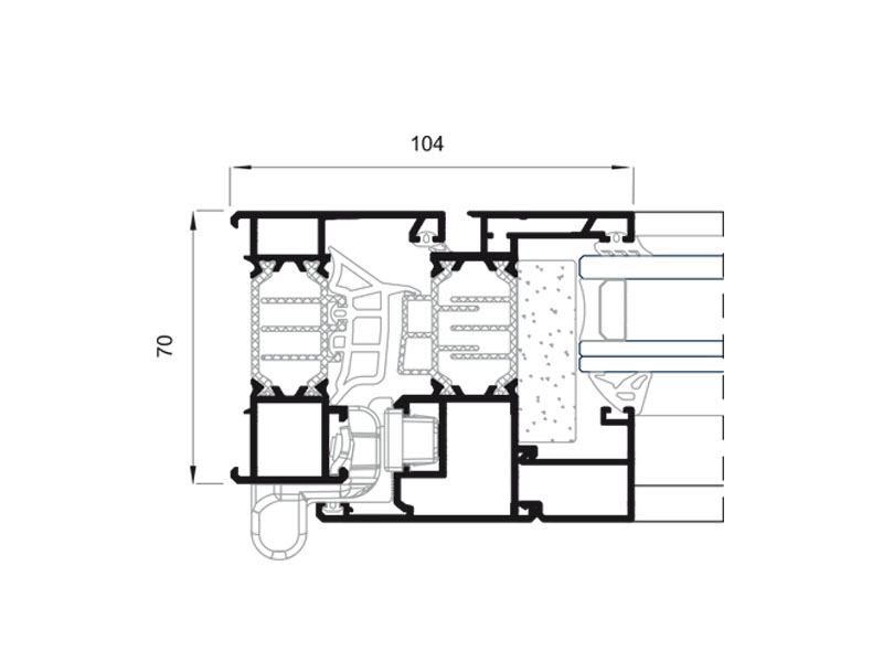 Sistema de janela batente de 70 mm, cuja potente capacidade de isolamento permite conseguir um coeficiente de transmissão térmica desde 0.8 W/m²K, obtido graças à perfeita conjunção e desenho de perfilaria de alumínio, varetas de poliamida tubulares de 35 mm, juntas de estanquidade tubulares de E.P.D.M. e um sistema de espuma de poliolefina colocada perimetralmente no bastidor do vidro. Possibilidade de folhas rectas e chanfreadas e de bites rectos, chanfreados e curvos. A sua grande capacidade de enchimento, até 58 mm, confere a este sistema umas excelentes prestações acústicas e térmicas ao permitir a utilização de vidros de grande espessura e eficiência energética.